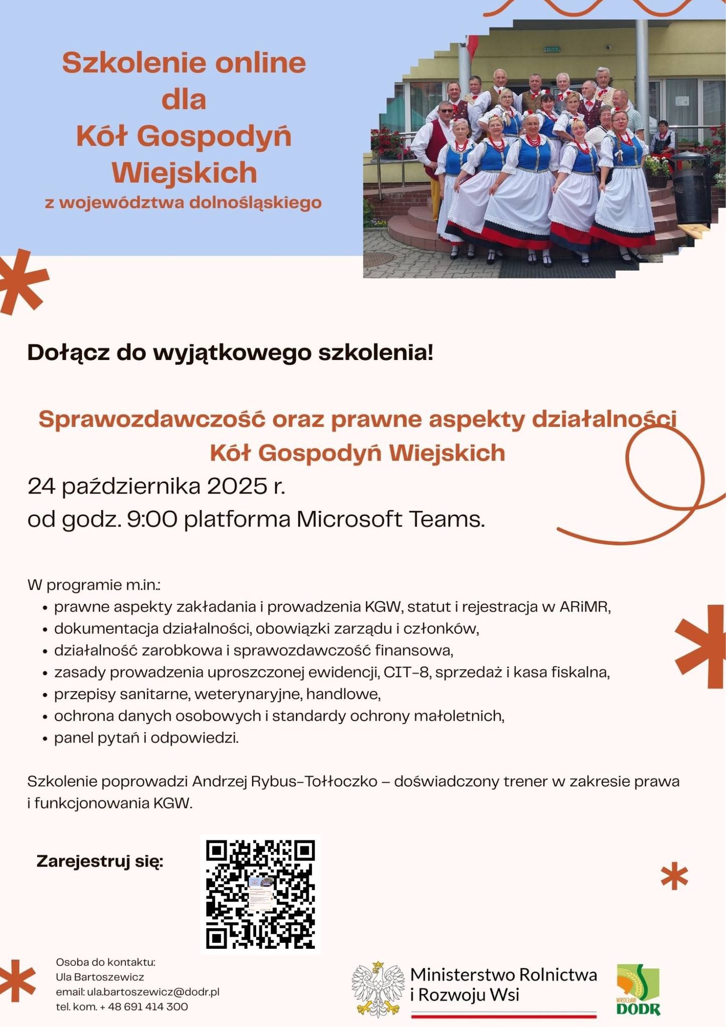 Szkolenie odbędzie się 24 października 2025 r. za pośrednictwem platformy Microsoft Teams. Podczas webinarium zostaną poruszone prawne aspekty zakładania i funkcjonowania Kół Gospodyń Wiejskich, ale też przepisy sanitarne, weterynaryjne i handlowe. Prowadzący omówi temat obowiązującej w KGW dokumentacji. Powie też o zasadach uproszczonej ewidencji, CIT-8 czy sprzedaży. Podczas spotkania będzie również czas na zadawanie pytań.