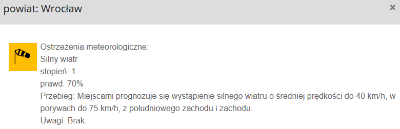 Miejscami prognozuje się wystąpienie silnego wiatru o średniej prędkości do 40 km/h, w porywach do 75 km/h, z południowego zachodu i zachodu. Prawdopodobieństwo wystąpienia zjawiska sięga 70%.