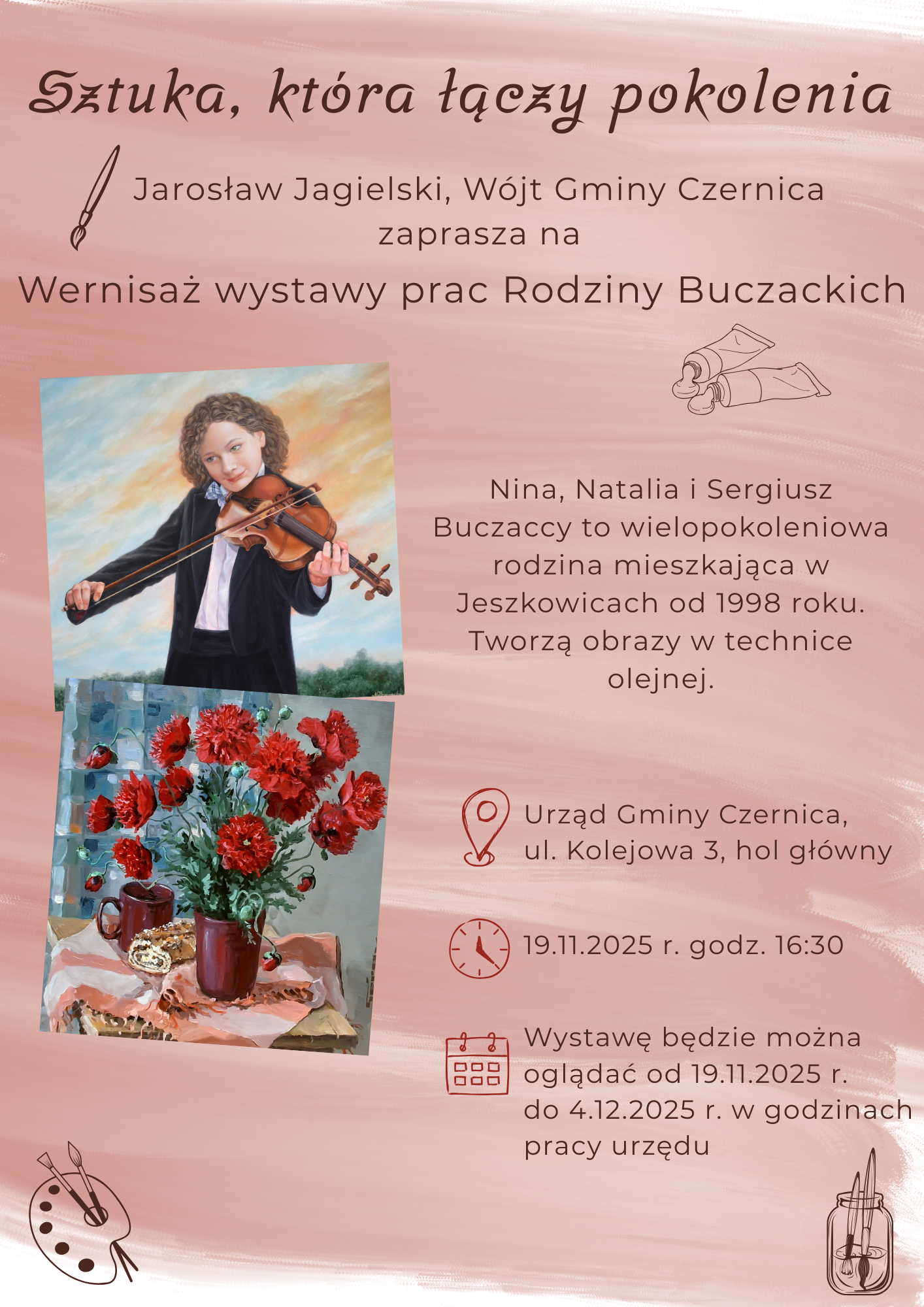 Jarosław Jagielski - Wójt Gminy Czernica serdecznie zaprasza na wernisaż i wystawę prac Rodziny Buczackich – Sergiusza, Niny i Natalii, artystów z Jeszkowic, tworzących w technice olejnej. Ich obrazy ukazują piękno portretu i natury.