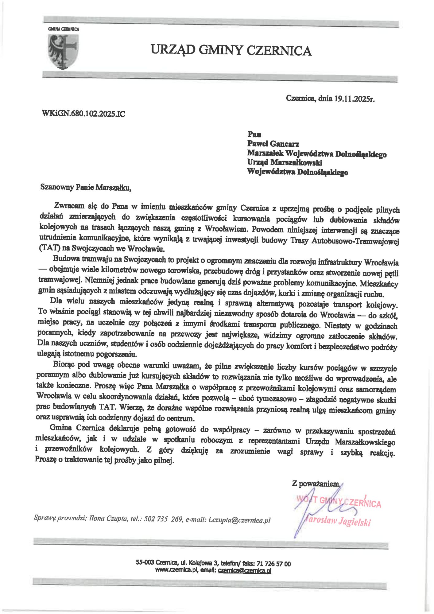 W dniu wczorajszym skierowałem oficjalne pismo do Marszałka Województwa Dolnośląskiego, Pana Pawła Gancarza, z prośbą o zwiększenie częstotliwości kursowania pociągów lub wzmocnienie składów na najbardziej obciążonych trasach.