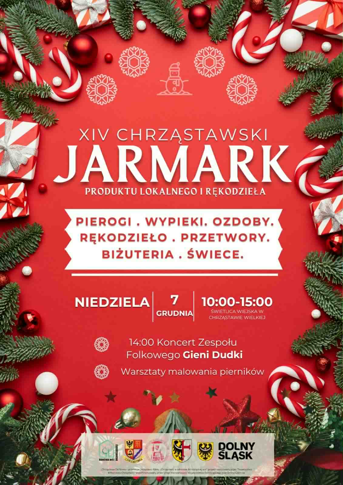 Czekać będzie na Was ponad 20 wystawców z różnorodnym i wyjątkowym asortymentem. Dzięki wsparciu Województwa Dolnośląskiego oraz Gminy Czernica Jarmark wzbogacą warsztaty malowania pierników oraz koncert wspaniałego zespołu Gieni Dudki.