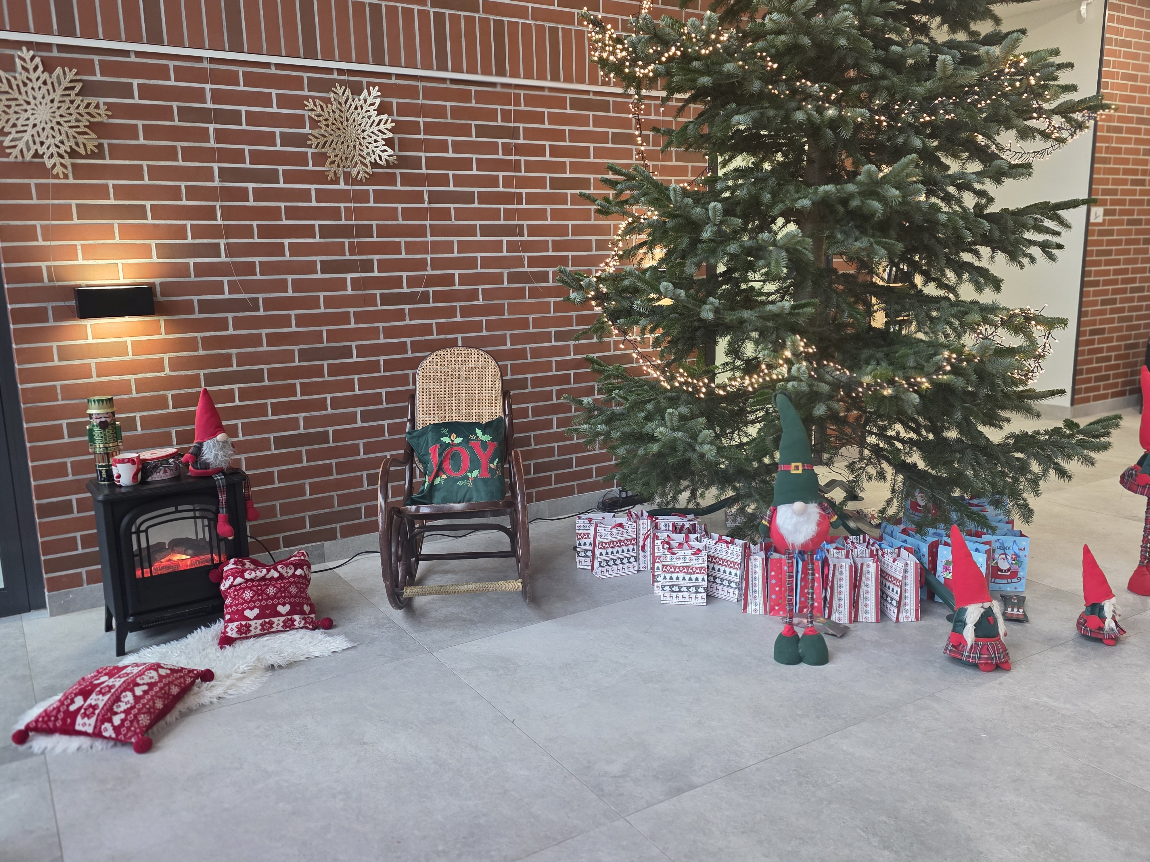 Dzieci i młodzież włożyły w przygotowanie swoich dekoracji całe serce — i właśnie za to zasłużyły na coś wyjątkowego. Nagle, w samym środku tej wesołej krzątaniny, drzwi uchyliły się… a zza nich wynurzyła się postać, na którą wszyscy po cichu czekali. Tak! To był sam Święty Mikołaj, z wielkim workiem prezentów — nie tylko dla najmłodszych, ale i dla dorosłych, czyli „pomocników” Mikołaja. Towarzyszyły mu uśmiechnięte Mikołajki oraz świetlista Śnieżynka, które dodały wydarzeniu bajkowego blasku.