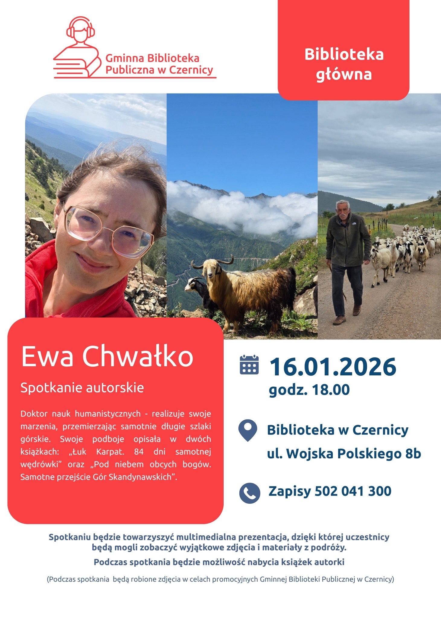 W imieniu Gminnej Biblioteki Publicznej w Czernicy serdecznie zapraszamy już w najbliższy piątek na spotkanie autorskie z Ewą Chwałko, mieszkanką naszej gminy!
