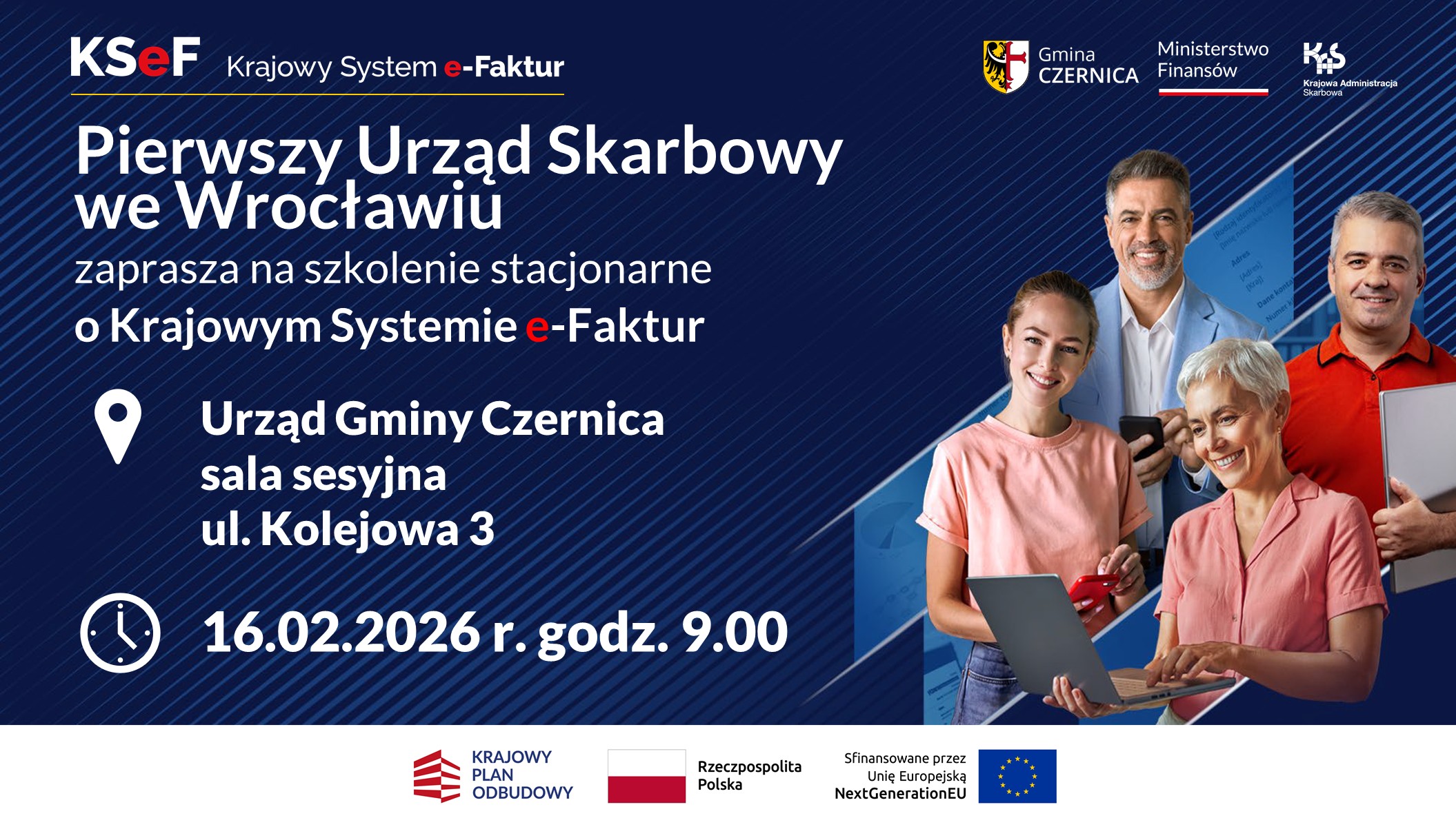 Zapraszamy przedsiębiorców na bezpłatne spotkanie dotyczące Krajowego Systemu e -Faktur (tzw. KSeF), które obędzie się w dniu 16 lutego 2026 r. o godz. 9.00 w sali sesyjnej Urzędu Gminy Czernica, ul. Kolejowa 3.