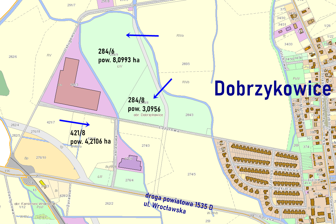 - Obszar terenów inwestycyjnych w Dobrzykowicach objęty jest miejscowym planem zagospodarowania przestrzennego – uchwały nr XIV/146/2020 Rady Gminy Czernica z dnia 31 marca 2020 r. w sprawie miejscowego planu zagospodarowania przestrzennego wsi Dobrzykowice (północ), gmina Czernica.