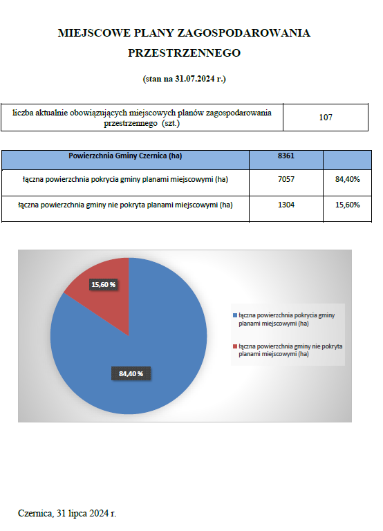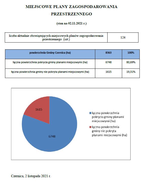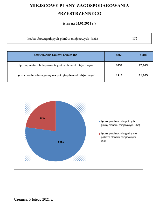 W 2016 roku na zlecenie Gminy Czernica został opracowany „Bilansu terenów przeznaczonych pod zabudowę” (załącznik do pobrania). Dokument ten podlega aktualizacji przy zmianie studium uwarunkowań i kierunków zagospodarowania przestrzennego. Ostatnia aktualizacja została uchwalona uchwałą nr XVIII/185/2020 Rady Gminy Czernica z dnia 9 września 2020 r. w sprawie uchwalenia zmiany studium uwarunkowań i kierunków zagospodarowania przestrzennego dla gminy Czernica 15 głosami Radnych (jednogłośnie).