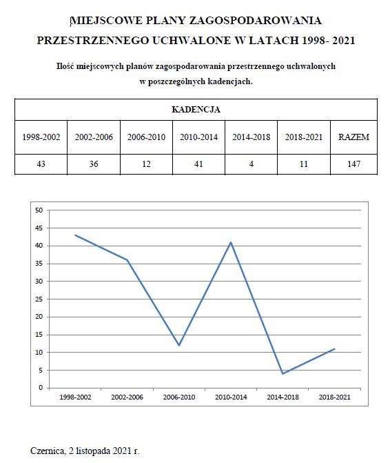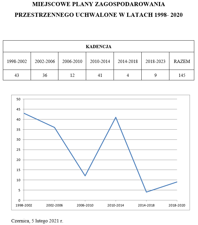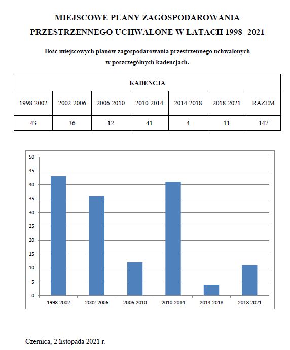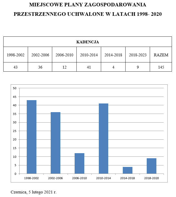 Na podstawie opracowanego bilansu, chłonność na wyznaczonych w miejscowych planach zagospodarowania przestrzennego (dalej mpzp) terenach mieszkaniowych, które jeszcze nie zostały zainwestowane w 2016 r. wynosiła blisko 52 tyś. mieszkańców. Biorąc pod uwagę, że w 2016 r. na terenie gminy zamieszkiwało ponad 14 tyś. mieszkańców (dane GUS), docelowa liczba osób na podstawie Bilansu, jakie mogą zamieszkać w Gminie Czernica to aż 66 tyś. mieszkańców. Większość mpzp, w ramach których dotychczasowe tereny rolnicze przeznaczone zostały pod zabudowę mieszkaniową została uchwalona w kadencjach: 1998-2002, 2002-2006, 2010-2014 (wykres poniżej).