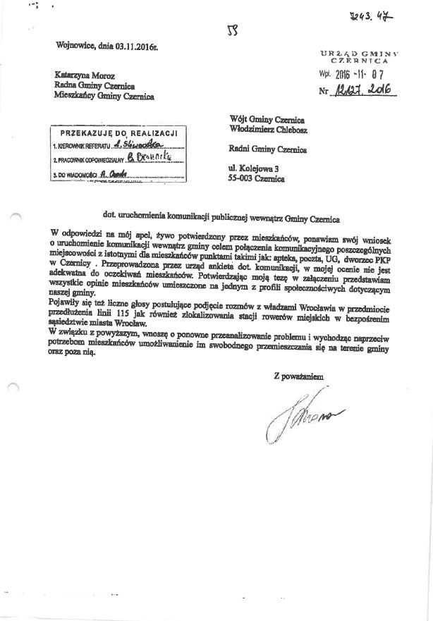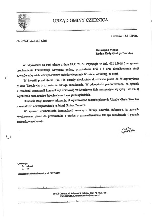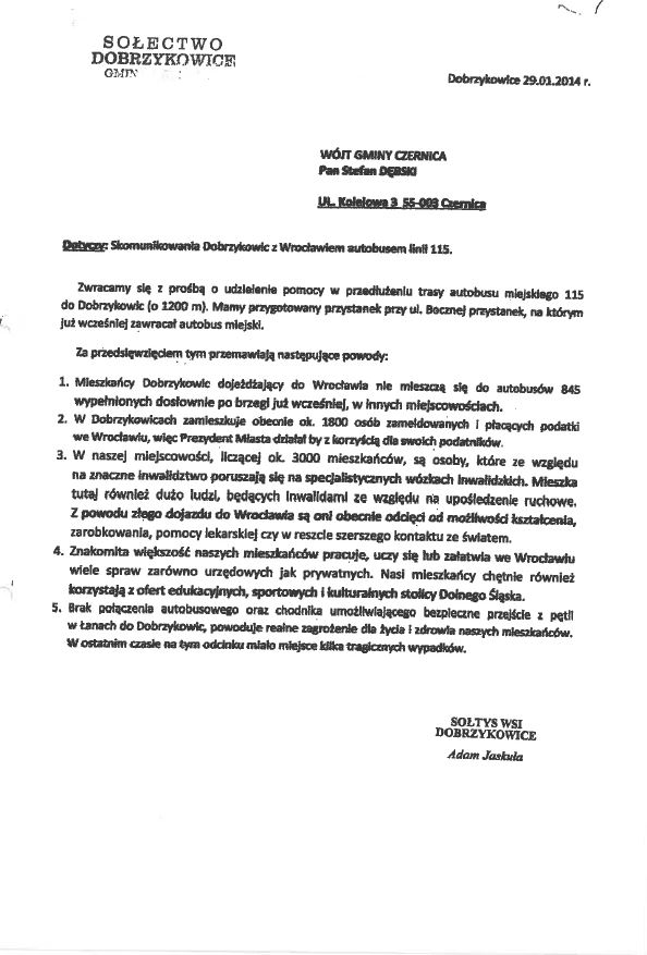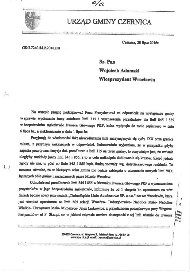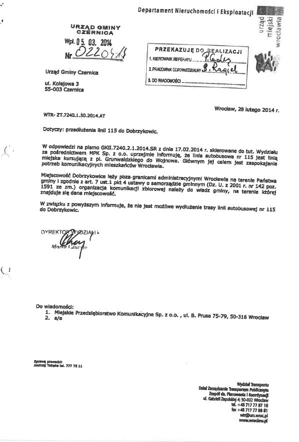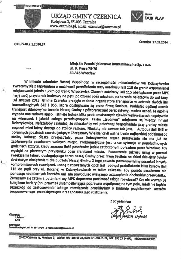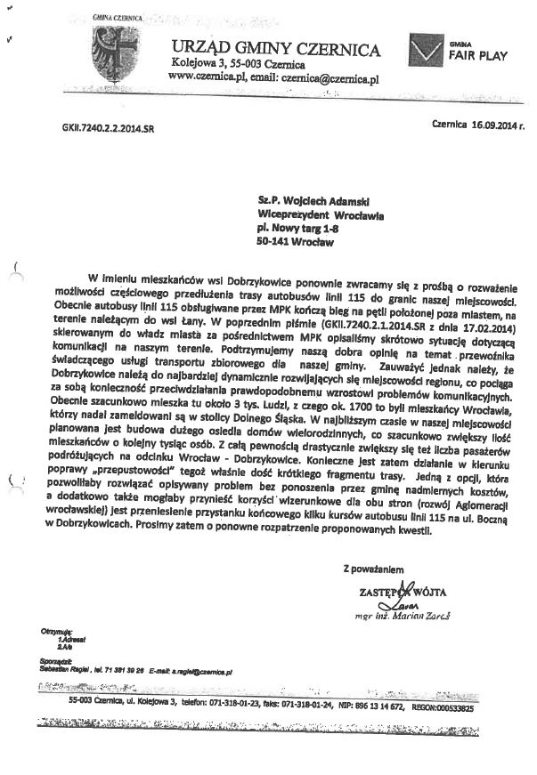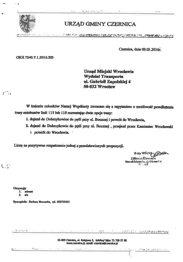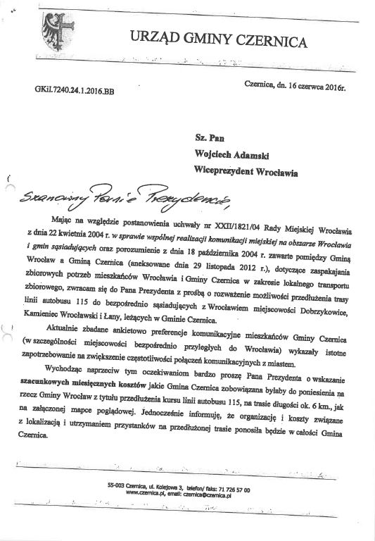 Poniżej historia kilkuletnich zabiegów Wójta Gminy Czernica oraz radnych i sołtysów z poszczególnych miejscowości o wydłużenie linii 115 i 118 na teren gminy Czernica.