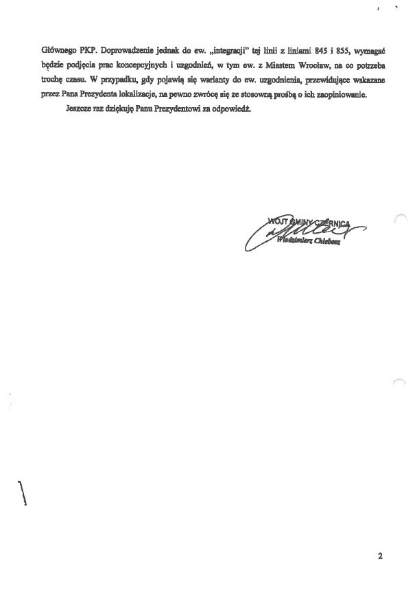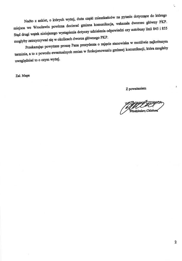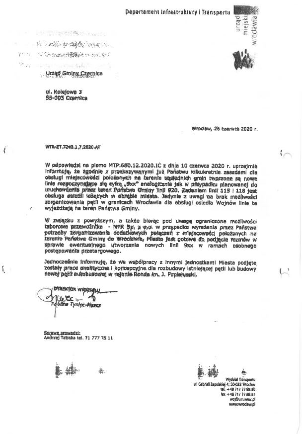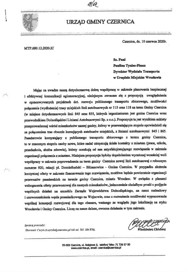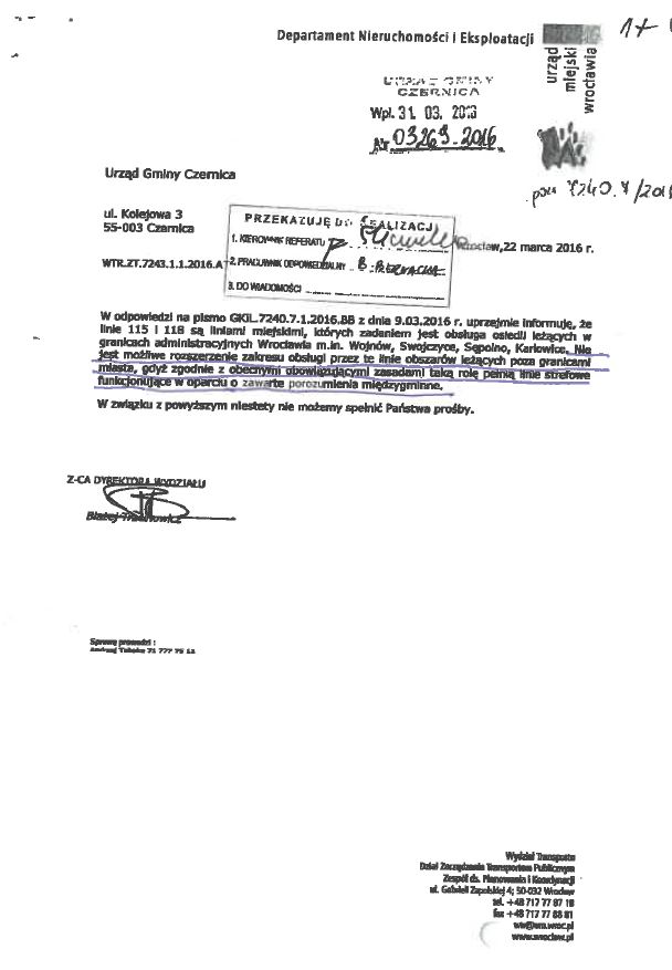Jak wynika z załączonych dokumentów miasto Wrocław konsekwentnie stoi na stanowisku, że linie autobusowe 115 i 118 są liniami miejskimi, kursującymi na trasie Wojnów-Plac Grunwaldzki, które zapewniają dojazd mieszkańcom osiedli Wojnów, Strachocin i Swojczyce do najbliższych węzłów przesiadkowych Sępolno i pl. Grunwaldzki i nie będą wydłużane na teren gmin sąsiednich. W tej sytuacji możliwe jest jedynie korzystanie z istniejących połączeń autobusowych z miastem, których organizatorem jest Gmina Czernica tj. liniami 845 i 855, oraz nową linią autobusową 920, która łączy pętlę na Wojnowie/Łanach z Wrocławiem (Galeria Dominikańska) przez Blizanowice i Trestno, której organizatorem jest miasto Wrocław.