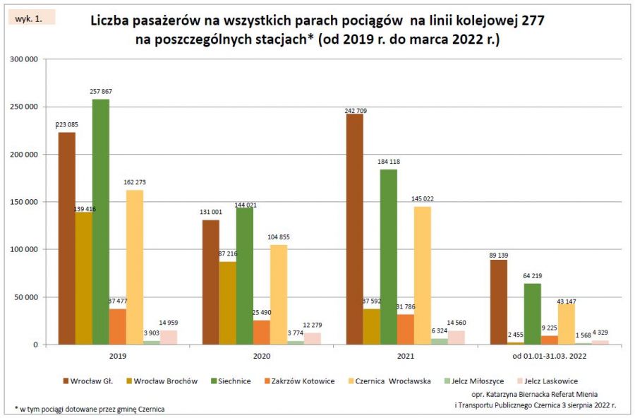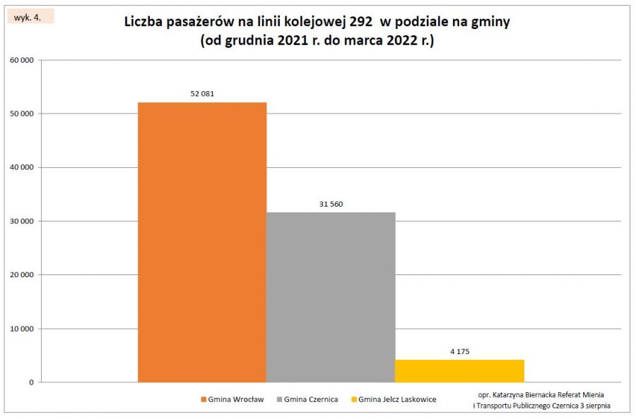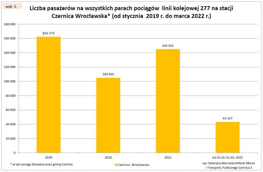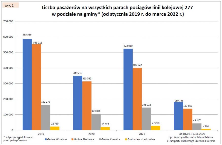 Na podstawie wykresów przedstawiających liczbę pasażerów na poszczególnych stacjach kolejowych (wyk.1) oraz w podziale na gminy (wyk.2) możemy zauważyć, że w okresie poddanym analizie linia 277 cieszy się sporym zainteresowaniem pasażerów z terenu gminy Czernica (max. 162.273 osób w 2019r.). Ilość pasażerów korzystających z linii 277 nieznacznie spada w kolejnych latach (2020-2021), co może mieć związek ze światową epidemią covid-19. Na najwyższym poziome znajduje się miasto Wrocław 585 586 pasażerów (max. 2019r.) natomiast najniżej przedstawia się frekwencja wśród pasażerów z Jelcza-Laskowic 22 765 (min. 2019r.). Jednoznacznie można zaobserwować, że z linii kolejowej 277 korzystają głównie mieszkańcy gmin sąsiadujących bezpośrednio z Wrocławiem czyli gminy Siechnice i gminy Czernica. Powodem tego jest niewielka odległość od miasta oraz stosunkowo szybki czas przejazdu. Można przyjąć założenie, że większość pasażerów to osoby dojeżdżające do miasta codziennie w celach zarobkowych, edukacyjnych lub rozrywkowych. Liczba pasażerów na wszystkich parach pociągów tj. na 22 parach (w tym 7 par pociągów dotowanych przez gminę), pokazuje (wyk.1). Ilość pasażerów w poszczególnych latach na stacji kolejowej Czernica Wrocławska obrazuje (wyk.3). W latach 2019 – 2021 liczba pasażerów nie spadała poniżej 100 tys. podróżnych. Okres z pierwszego kwartału roku 2022 wskazuje, że z połączenia na tej linii skorzystało ponad 43 tys. pasażerów. Od lutego 2022 pojawia się jednak znaczny spadek liczby pasażerów, przy jednoczesnym wzroście ich ilości na drugiej linii kolejowej przebiegającej przez teren gminy (292), co obrazuje (wyk. 6). Ostatecznie w marcu 2022 odwraca się potok pasażerów, z których większość korzysta z nowego połączenia. Sytuacja ma związek z wprowadzeniem autobusowej komunikacji zastępczej, co znacznie pogorszyło komfort i czas podróży. Powodem może być również ilość stacji kolejowych na terenie Wrocławia, które obsługuje linia 292 (11 stacji kolejowych w mieście), co pozwala na dojazd do różnych miejsc na terenie miasta bez potrzeby przesiadki na MPK. Ciekawym jest fakt, że porównywalna a nawet większa ilość pasażerów korzysta z nowej linii, chociaż obsługuje ją znacznie mniejsza ilość pociągów (7 par do marca 2022 i 12 par od marca 2022r.)