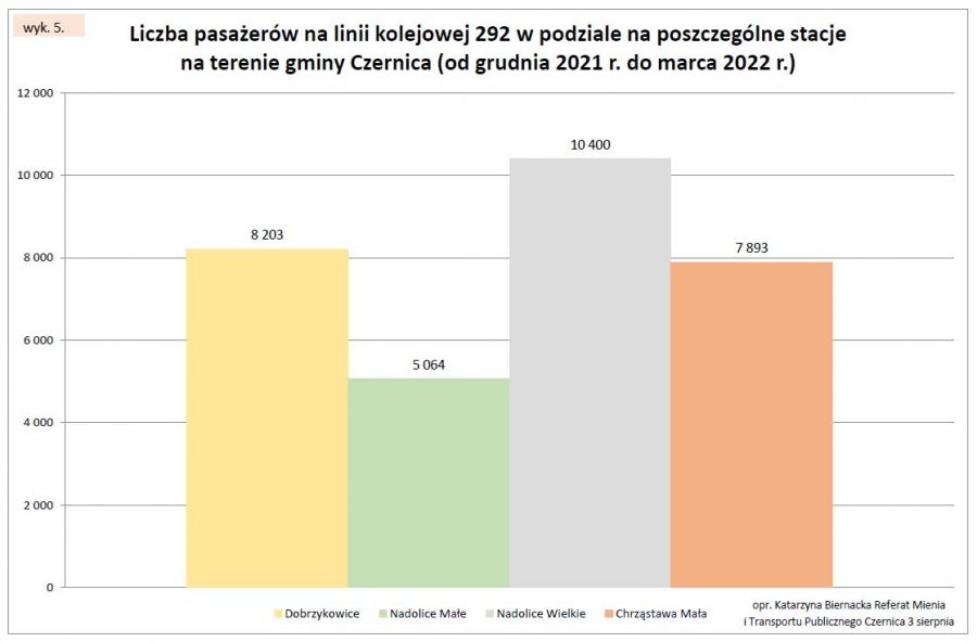 Linia 292 została uruchomiona w grudniu 2021 r. a wyniki pokazują, że od początku jej funkcjonowania cieszy się dużym zainteresowaniem pasażerów (wyk.4). Na obszarze gminy Czernica, znajdują się cztery stacje kolejowe (w Chrząstawie Małej, Nadolicach Wielkich, Nadolicach Małych oraz w Dobrzykowicach). Dodatkowo pasażerowie z terenu gminy Czernica korzystają z przystanku kolejowego Wrocław Wojnów Wschód, w rejon którego dojeżdża komunikacja gminna (845,855), wewnątrzgminna (Z1,Z2), linie miejskie (115,118) oraz linia aglomeracyjna 920. W sąsiedztwie każdej z wymienionych stacji kolejowych zlokalizowane są nowoczesne parkingi typu Park&Ride, na których pasażerowie mogą pozostawić samochód lub rower by kontynuować podróż do miasta pociągiem. Linia kolejowa 292 dowozi pasażerów do 11 stacji kolejowych położonych w różnych częściach Wrocławia, w tym stację Wrocław Główny. Dla porównania, linia 277 obsługuje tylko stację Wrocław-Brochów oraz Wrocław Główny. W podziale na obsługiwane stacje (wyk.5), w gminie Czernica najwięcej podróżnych odnotowano na stacji w Nadolicach Wielkich 10 400 osób, Dobrzykowice 8 203 osób, Chrząstawa Mała 7 893 osób, Nadolice Małe 5 064 osób. Łącznie w okresie poddanym analizie z linii kolejowej 292 skorzystało 31.560 pasażerów, obsługiwanych przez 7 par pociągów w okresie do marca 2022 oraz 12 par od marca 2022r. W liczbach tych nie uwzględniono pasażerów - uchodźców wojennych z Ukrainy, którzy podróżowali bez biletów. Wszystkie pociągi na linii kolejowej 292 są dotowane przez gminę.