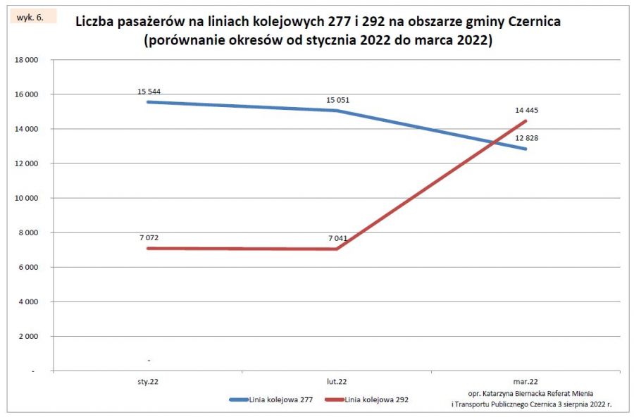 Porównując obie linie kolejowe 277 i 292 (wyk.6) w tym samym okresie tj. od stycznia do marca 2022 r. obserwujemy widoczny spadek pasażerów na linii 277 już od lutego 2022 (czyli przed remontem i wprowadzeniem autobusowej komunikacji zastępczej i przecięcie się linii na wykresie nr 6 w marcu 2022r. To „odwrócenie” znaczenia poszczególnych linii, może mieć związek z wprowadzeniem zastępczej komunikacji autobusowej od 14 marca 2022 r. na linii 277. Powodem może być również większa dostępność ze względu na ilość przystanków i stacji PKP na terenie gminy (4 stacje PKP: Chrząstawa Mała, Nadolice Wielkie, Nadolice Małe, Dobrzykowice oraz dodatkowo dostępna dla komunikacji gminnej stacja Wrocław Wojnów-Wschód. Na trasie linii 277 znajduje się tylko jedna stacja w Czernicy Wrocławskiej), możliwość pozostawienia pojazdu na parkingu w bezpośrednim sąsiedztwie stacji PKP oraz większa dywersyfikacja stacji kolejowych na terenie miasta Wrocławia.
