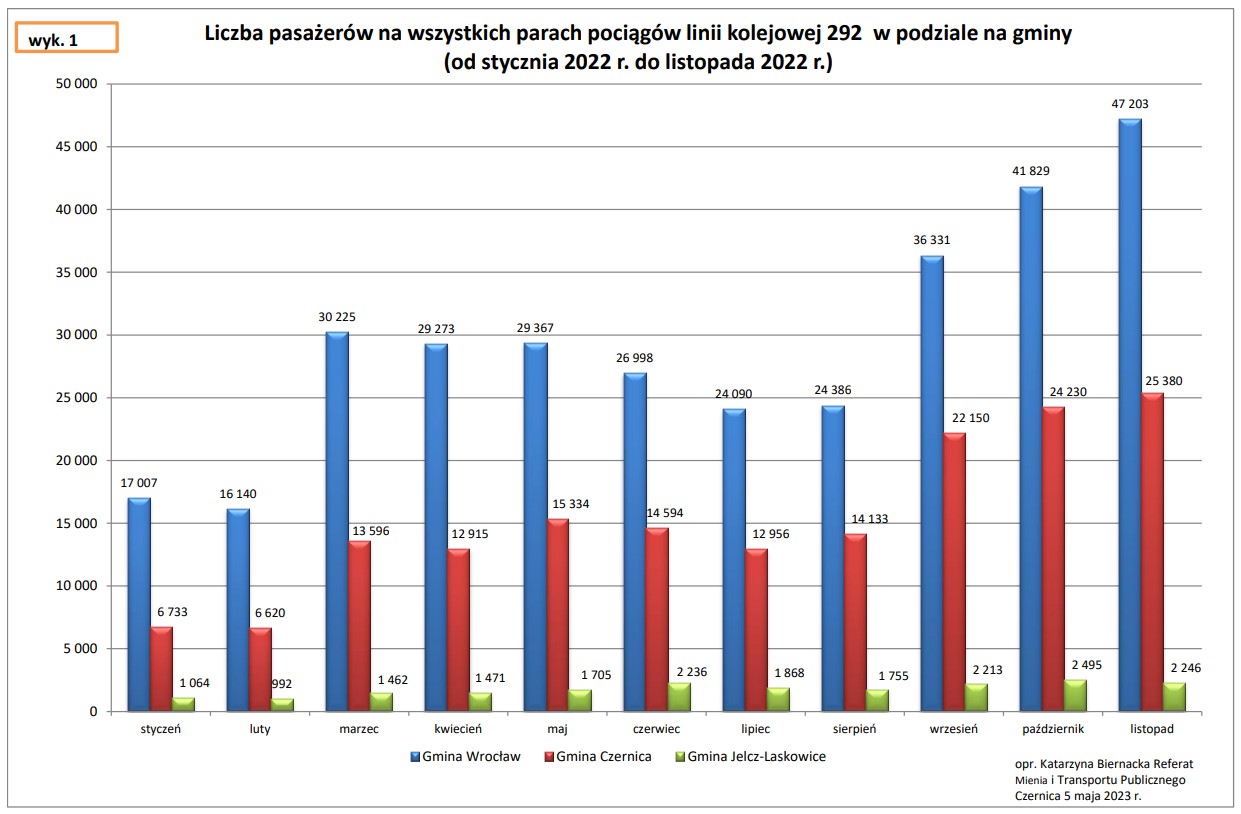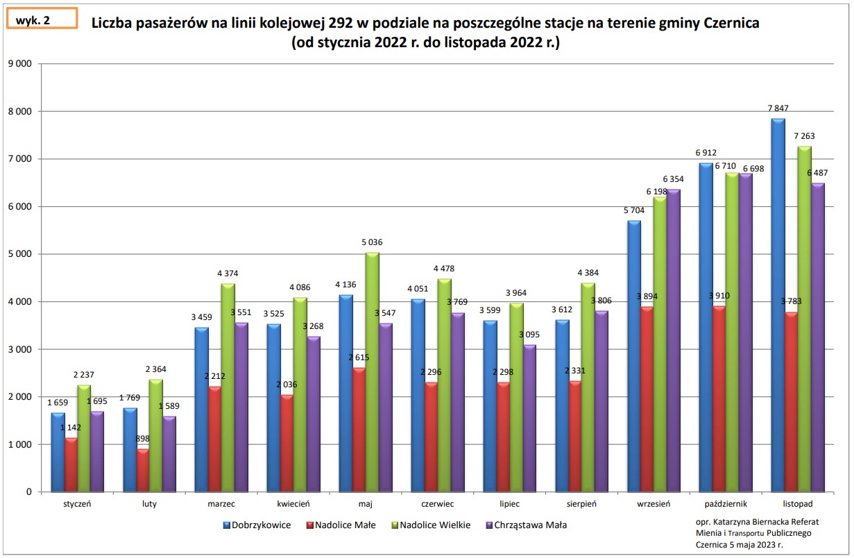 W podziale na obsługiwane stacje oraz miesiące (wyk.2.), w gminie Czernica najwięcej podróżnych za okres od stycznia 2022 r do listopada 2022 r. odnotowano na stacji w Nadolicach Wielkich 51 094 osób, Dobrzykowice 46 273 osób, Chrząstawa Mała 43 859 osób, Nadolice Małe 27 415 osób. Łącznie w okresie poddanym analizie z linii kolejowej 292 skorzystało 168 641 pasażerów, obsługiwanych przez 14 par pociągów w analizowanym okresie.