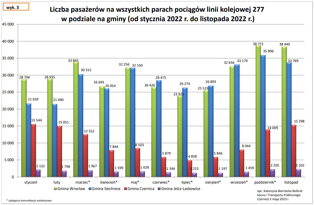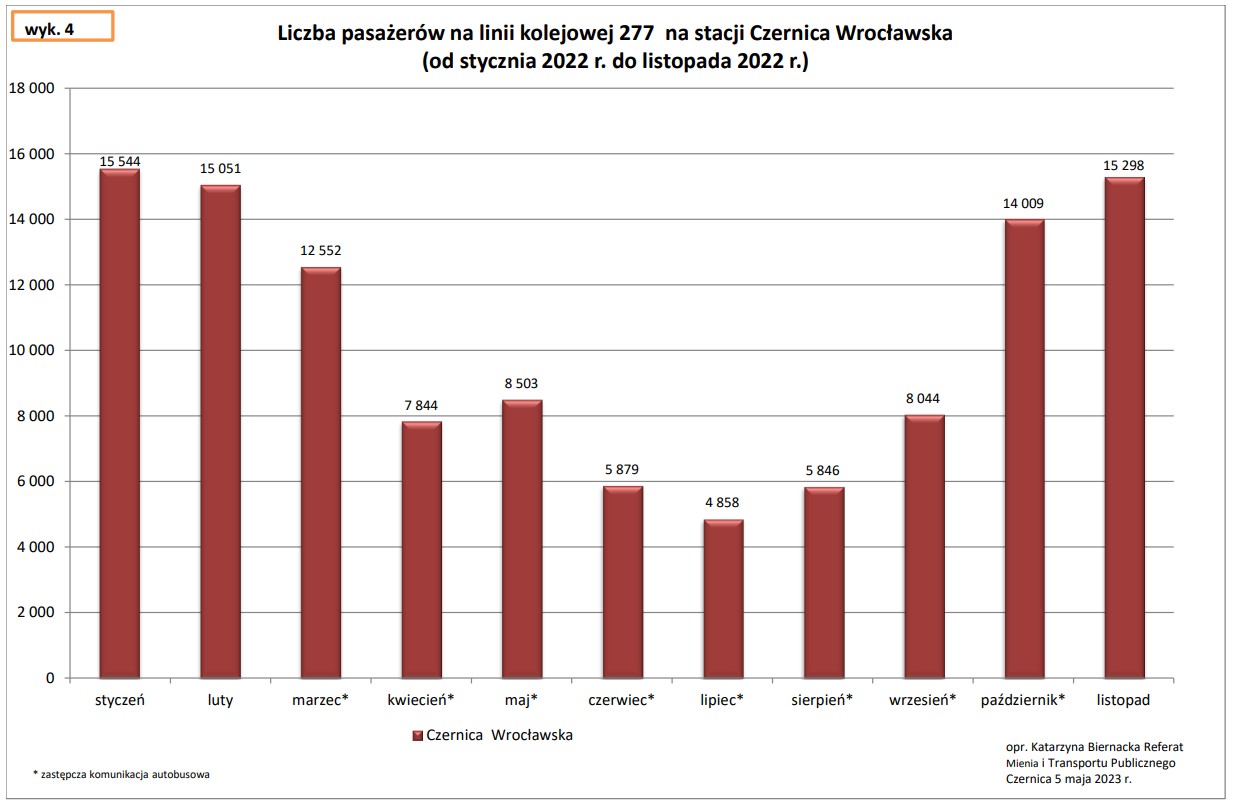 Liczbę pasażerów w poszczególnych miesiącach od stycznia 2022 r. do listopada 2022 r. na stacji kolejowej Czernica Wrocławska przedstawia (wyk. 4). W okresie letnim (tj. czerwiec, lipiec, sierpień) liczba pasażerów nie przekraczała 6 tys. osób. Natomiast od października (wznowienie kursowania pociągów od połowy miesiąca) zauważyć można tendencję wzrostową liczby korzystających z tego połączenia. W marcu było 15 554 pasażerów, a w listopadzie 15 298. Świadczy to o utrzymującym się zainteresowaniu mieszkańców tym połączeniem z miastem Wrocław. Poziom ten jest równy z frekwencją na tej linii sprzed remontu i wprowadzenia autobusowej komunikacji zastępczej